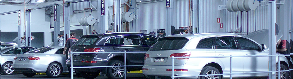 Automotive workshop fit-out with lubrication hose reels mounted in between service bays, Audi Parramatta