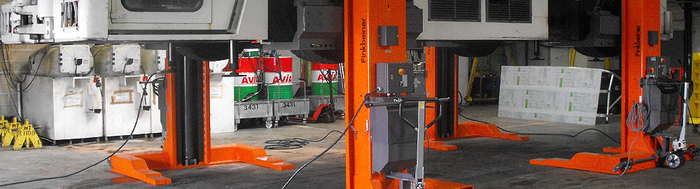 Mobile column lift showing an aircraft tow tractor