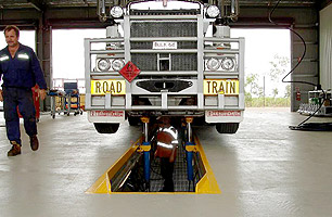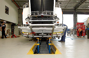 A prime mover being jacked up on the Hartex pit jacks. The mechanic can now walk around safely with ease